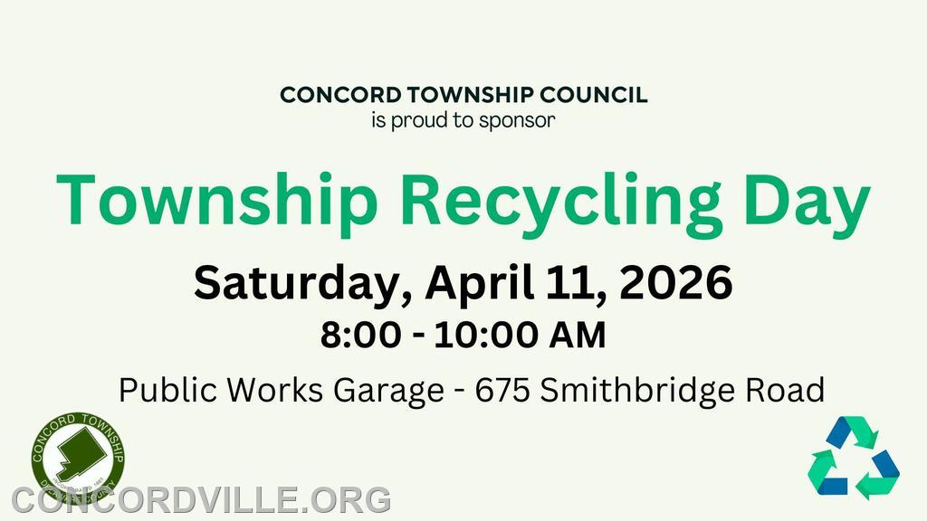 | Event by Concord Township, Delaware County, PA Public Works Garage - 675 Smithbridge Road Duration: 2 hr Concord Township Resident Recycling Day Saturday, April 11, 2026 8:00 AM - 10:00 AM Public Works Garage - 675 Smithbridge Road - Reduce, Reuse, RECYCLE. A FREE event for Concord Township residents - ONLY! Proof of residency required. - Also, FREE Tree Giveaway. - Recycle Electronics - anything with a plug. (Limit of one TV or Computer Monitor per household.) - PECO Appliance Recycling - recycle your old, working room air conditioners, dehumidifiers, or mini fridges at no cost. - Donate Clothing & other household items. - Medication Disposal. - Shred Documents. (3-box limit for shredding.) Not accepted: smoke detectors, batteries, large appliances, projection TVs, wooden console TVs, hazardous waste, or fluorescent bulbs. |